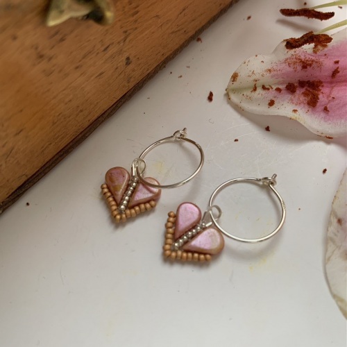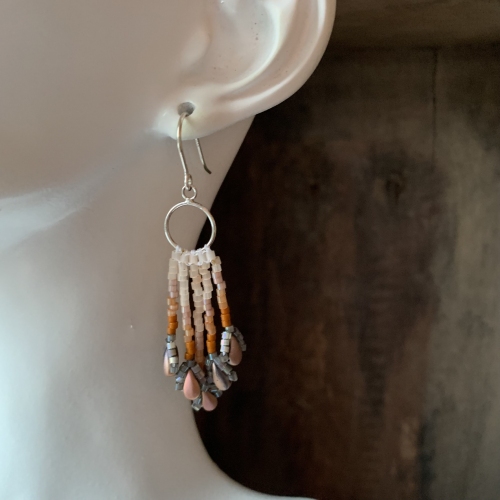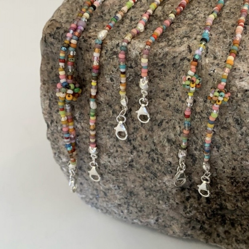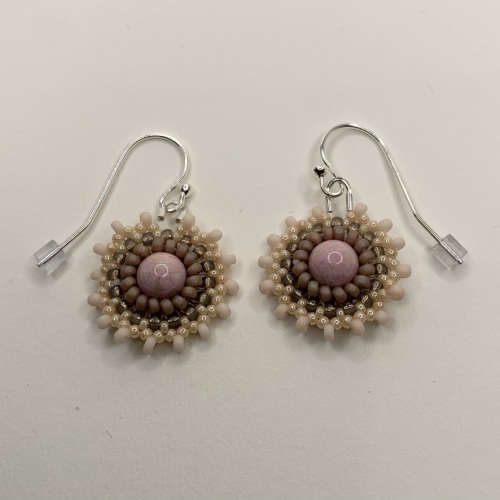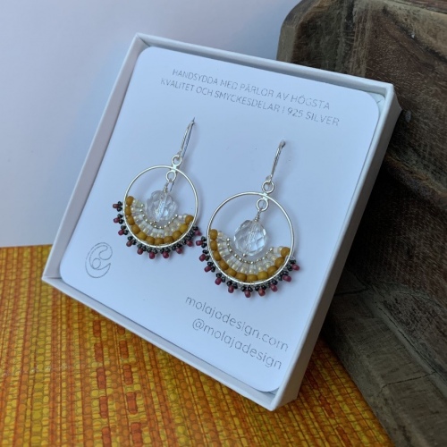 Jag arbetar med en kombination av olika pärlsömnadstekniker och små pärlor av glas, samt smyckesdelar i 925 silver.